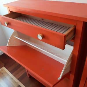 Tanto al primer como a la pintura les debes de añadir un 5% de agua a la cantidad que vayas a utilizar (para entendernos, un chorreoncito). Remueve bien y así será más fácil aplicarla. Una vez pintado el mueble ten cuidado unas tres semanas hasta que la pintura esté bien seca.