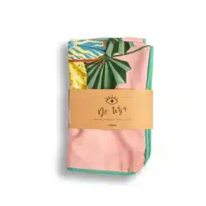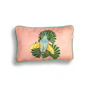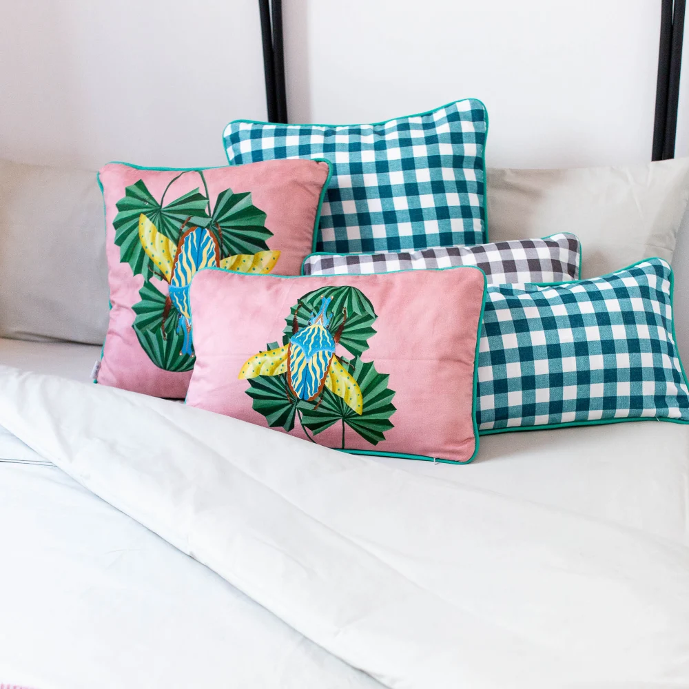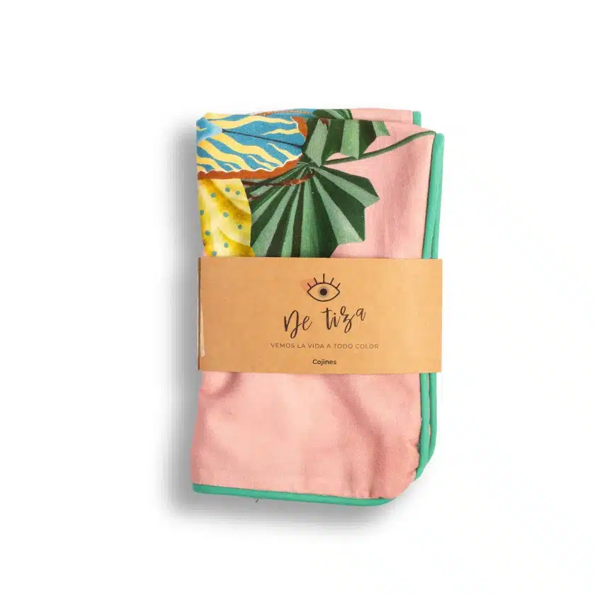 Funda de cojín sin relleno Beetle. Color rosa y bordón verde.