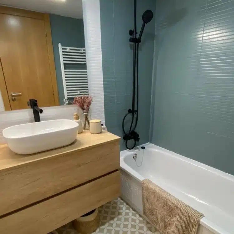 Tienes que tener especial cuidado con las zonas que tienen residuos de silicona (juntas de bañera, lavabo, perfiles de aluminio de mamparas…) puesto que, aunque no se aprecia quedan restos y estos imposibilitan el agarre de la pintura por ello hay que lijar bien la zona a tratar.