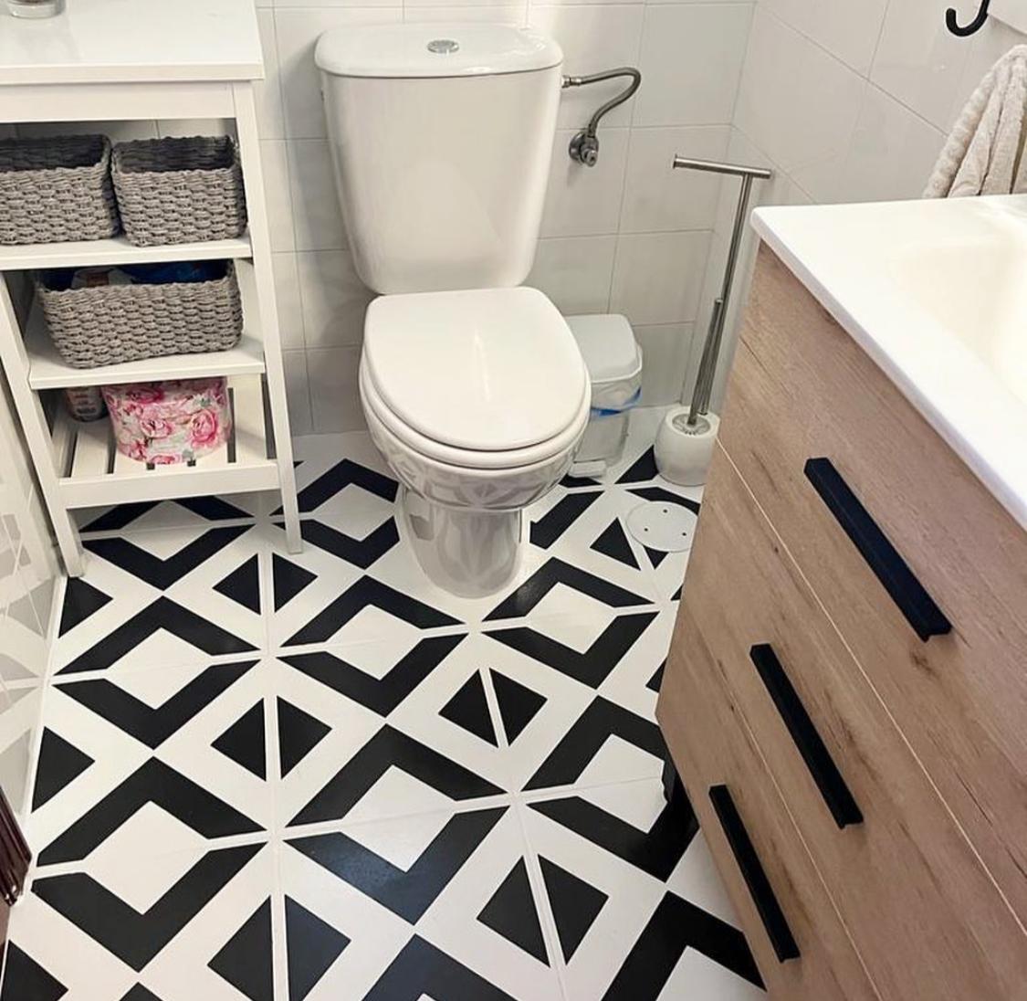- Podemos dejar nuestros suelos de un solo color o una vez pintado y seco, decorarlo con plantillas. En el caso que decidas decorarlo, asegúrate que mínimo han pasado 8 horas y un máximo de 12 horas antes de aplicar el barniz de acabado.