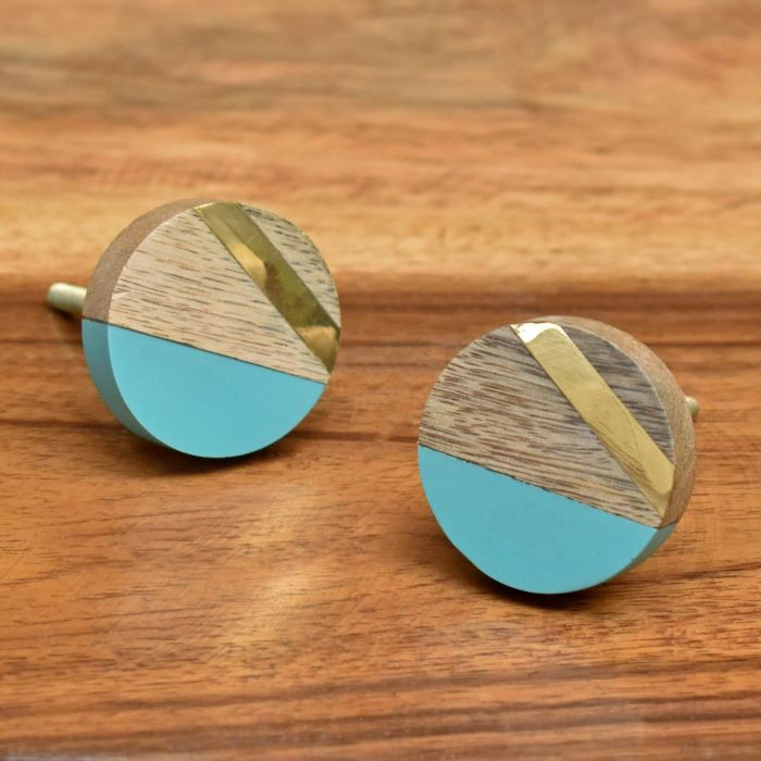 Tirador con diseño geométrico de latón y madera de resina turquesa. Ref Dt0136